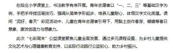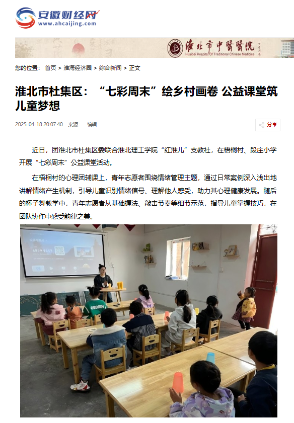 近日,团淮北市杜集区委联合伟德国际victor1946官网“红淮儿”支教社,在梧桐村、段庄小学开展“七彩周末”公益课堂活动。对此,安徽财经网进行了报道: