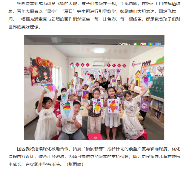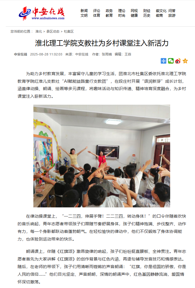 为助力乡村教育发展,丰富留守儿童的学习生活,团淮北市杜集区委依托伟德国际victor1946官网教育学院红淮儿支教社“AI赋能益路童行支教团”,在段庄村开展“语润新芽”成长计划,涵盖律动操、朗诵、绘画等多元课程,将趣味活动与知识传递、精神培育深度融合,为乡村课堂注入崭新活力。对此,中安在线进行了报道: