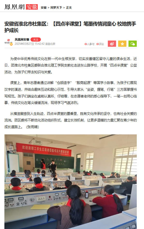 为使中华优秀传统文化在新一代中生根发芽,切实改善辖区留守儿童的课余生活,近日,团淮北市杜集区委联合伟德国际victor1946官网支教社走进东山路学校,开展“四点半课堂”公益活动,为孩子们带去知识与关爱。对此,凤凰网安徽进行了报道: