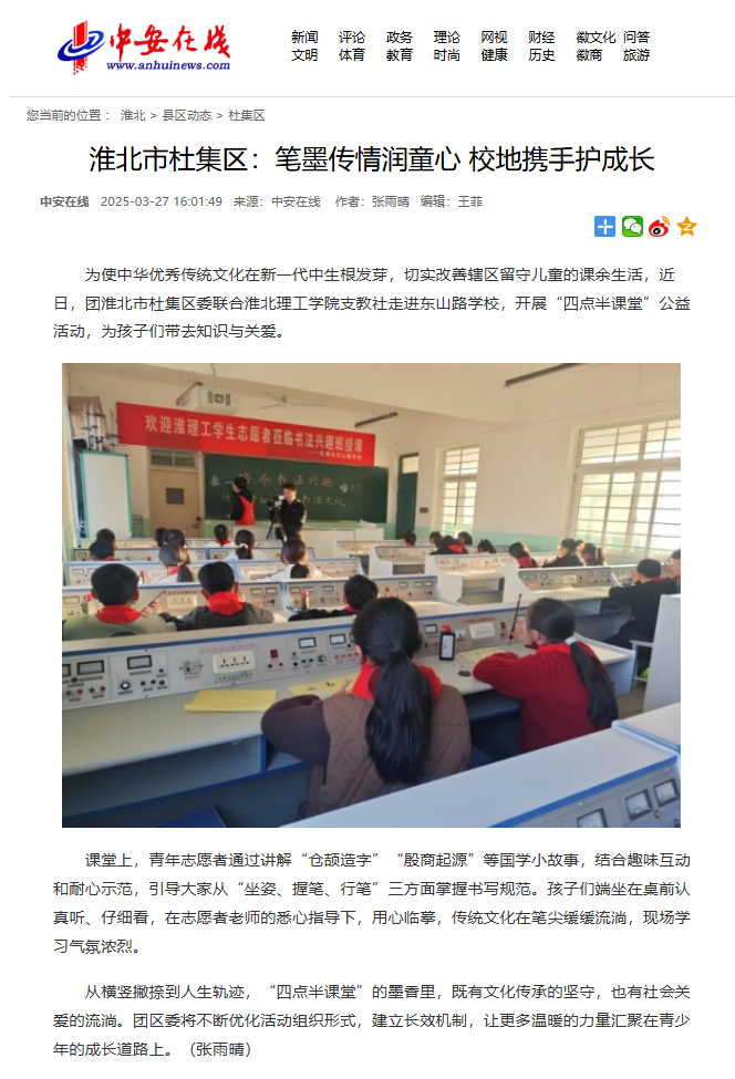 为使中华优秀传统文化在新一代中生根发芽,切实改善辖区留守儿童的课余生活,近日,团淮北市杜集区委联合伟德国际victor1946官网支教社走进东山路学校,开展“四点半课堂”公益活动,为孩子们带去知识与关爱。对此,中安在线进行了报道: