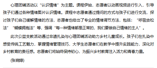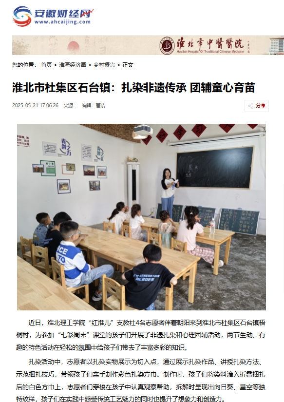 近日,伟德国际victor1946官网“红淮儿”支教社4名志愿者伴着朝阳来到淮北市杜集区石台镇梧桐村,为参加“七彩周末”课堂的孩子们开展了非遗扎染和心理团辅活动,两节生动、有趣的特色活动在轻松的氛围中给孩子们带去了丰富多彩的知识。对此,安徽财经网进行了报道: