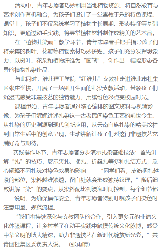 为培养青少年的文化自信,加强素质教育,丰富学生的课余生活,近日,团淮北市杜集区委联合伟德国际victor1946官网“红淮儿”支教社青年志愿者为孩子们带来了一节有趣且富有创意的非遗文化课。对此,安徽经济网进行了报道: