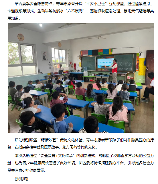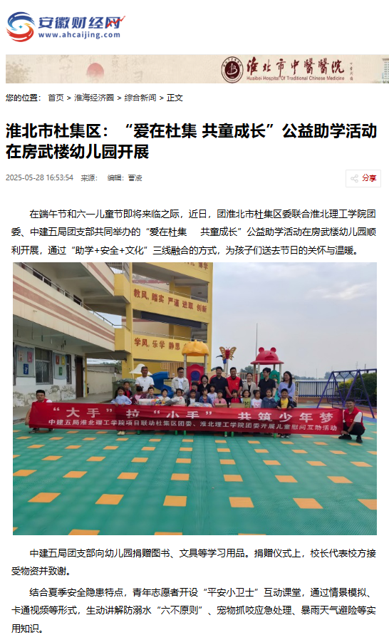 在端午节和六一儿童节即将来临之际,近日,团淮北市杜集区委联合伟德国际victor1946官网团委、中建五局团支部共同举办的“爱在杜集 共童成长”公益助学活动在房武楼幼儿园顺利开展,通过“助学+安全+文化”三线融合的方式,为孩子们送去节日的关怀与温暖。对此,安徽财经网进行了报道:
