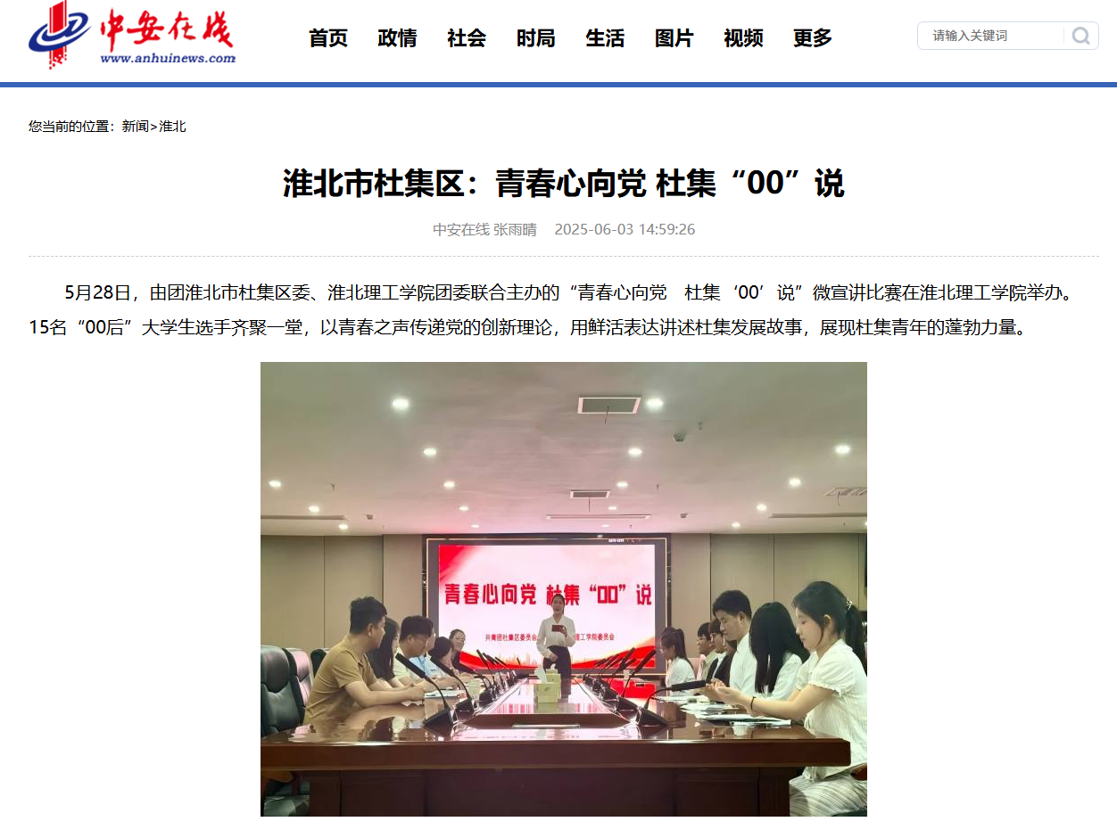 5月28日,由团淮北市杜集区委、伟德国际victor1946官网团委联合主办的“青春心向党 杜集‘00’说”微宣讲比赛在伟德国际victor1946官网举办。15名“00后”大学生选手齐聚一堂,以青春之声传递党的创新理论,用鲜活表达讲述杜集发展故事,展现杜集青年的蓬勃力量。对此,中安在线进行了报道: