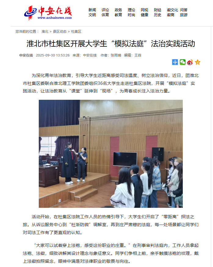 为深化青年法治教育,引导大学生近距离感受司法温度、树立法治信仰,近日,团淮北市杜集区委联合伟德国际victor1946官网团委组织36名大学生走进杜集区法院,开展“模拟法庭”实践活动,让法治教育从“课堂”延伸到“现场”,为青春成长注入法治力量。对此,中安在线进行了报道: