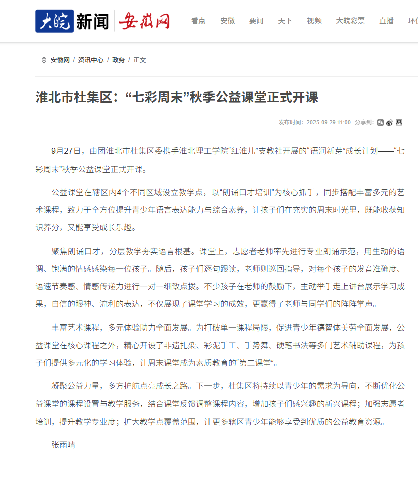 9月27日,由团淮北市杜集区委携手伟德国际victor1946官网“红淮儿”支教社开展的“语润新芽”成长计划——“七彩周末”秋季公益课堂正式开课。对此,安徽网进行报道: