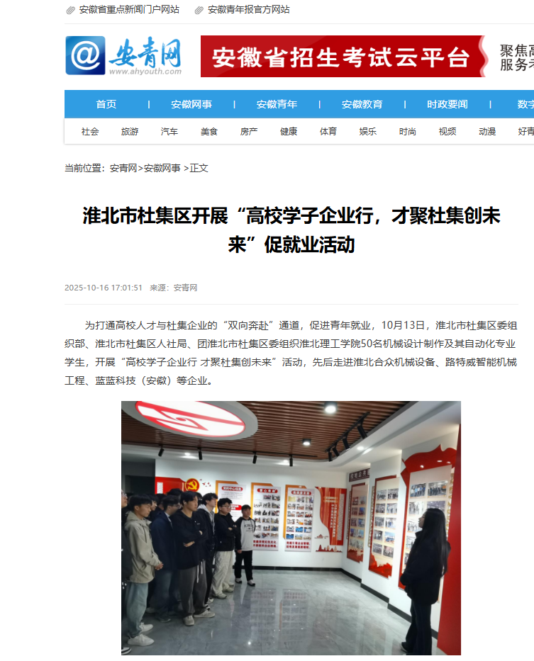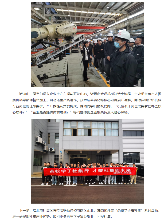 为打通高校人才与杜集企业的“双向奔赴”通道,促进青年就业,10月13日,淮北市杜集区委组织部、淮北市杜集区人社局、团淮北市杜集区委组织伟德国际victor1946官网50名机械设计制作及其自动化专业学生,开展“高校学子企业行 才聚杜集创未来”活动,先后走进淮北合众机械设备、路特威智能机械工程、蓝蓝科技(安徽)等企业。对此,安青网进行了报道: