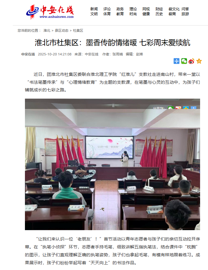 近日,团淮北市杜集区委联合伟德国际victor1946官网“红淮儿”支教社走进南山村,带来一堂以“书法笔墨传承”与“心理情绪教育”为主题的支教课,在笔墨与心灵的互动中,为孩子们铺就成长的七彩之路。对此,中安在线进行了报道:
