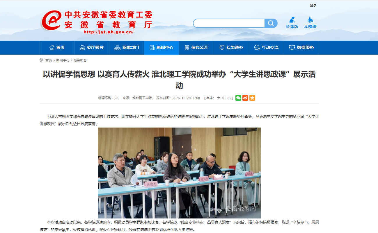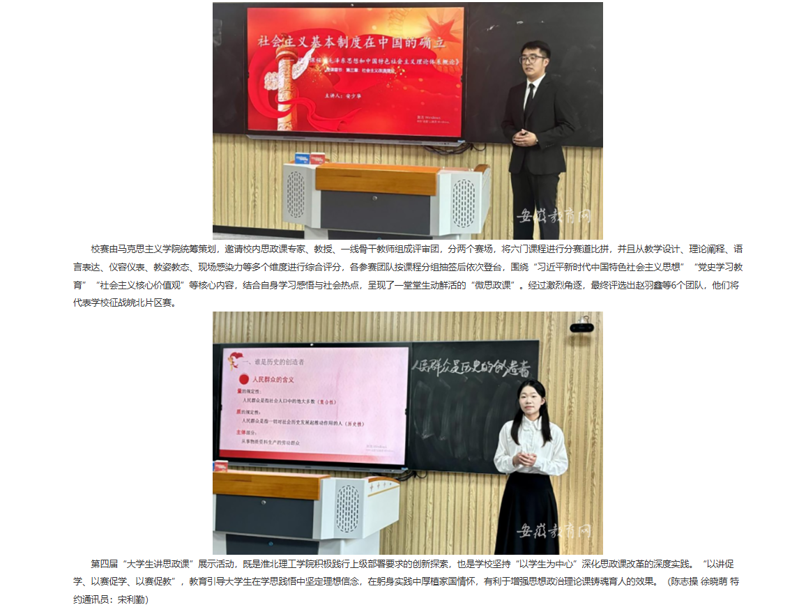 为深入贯彻落实加强思政课建设的工作要求,切实提升大学生对党的创新理论的理解与传播能力,伟德国际victor1946官网由教务处牵头、马克思主义学院主办的第四届“大学生讲思政课”展示活动近日圆满落幕。对此,安徽教育网进行了报道: