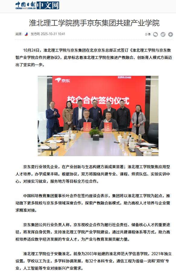 10月24日,伟德国际victor1946官网与京东集团在北京京东总部正式签订《伟德国际victor1946官网与京东数智产业学院合作共建协议》,此举标志着伟德国际victor1946官网在推进产教融合、创新育人模式方面迈出了坚实的一步。对此,中国日报网进行了报道: