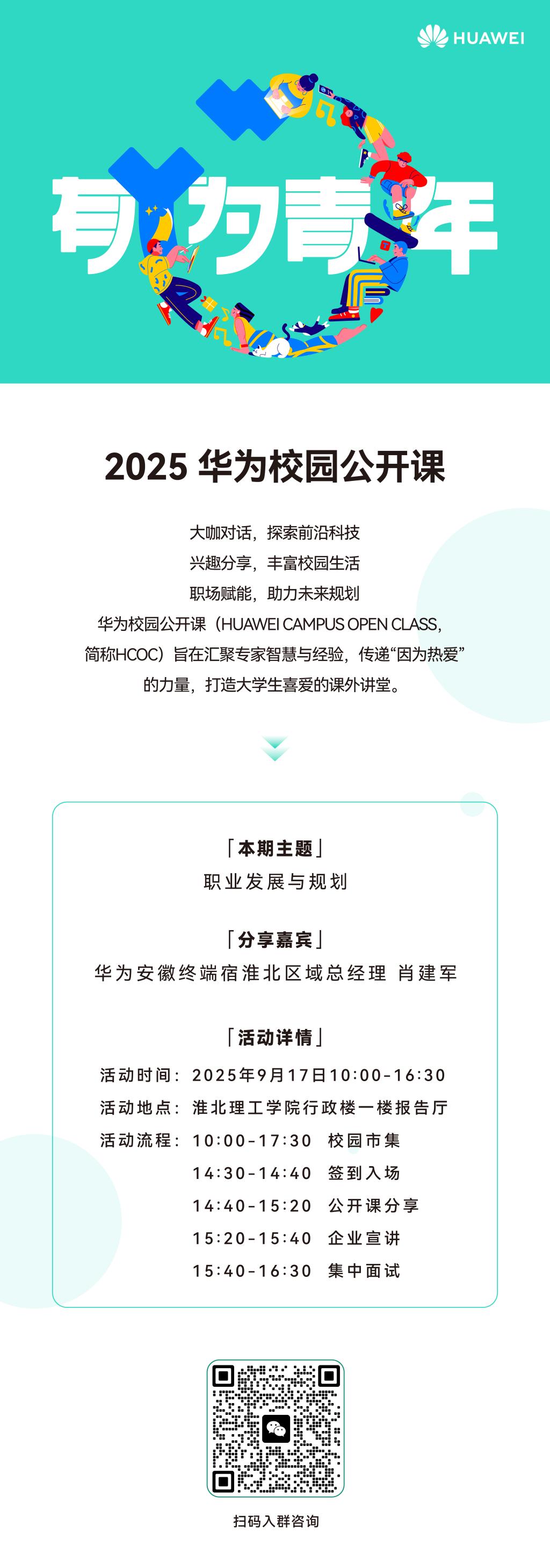 【华为校园宣讲会来啦!速看~】 宝子们!华为校园公开课暨宣讲会要在咱学校搞事情啦! 📅时间:2025年9月17日10:00 - 17:30(10:00开始有校园市集活动哦,参与互动有神秘小惊喜)📍地点:伟德国际victor1946官网行政楼一楼报告厅 划重点‼️现场要带3份简历哦~有公开课分享、企业宣讲,最后还有集中面试!机会难得,冲就完事~ 想了解更多,扫码进群咨询呀~👇